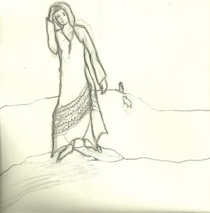 This woman is wondering why she is wearing such a fancy, ruffled dress. She may have a headache. She is confused. Her right hand is filthy. Or perhaps just poorly drawn. I am going to do some serious investigating about paper quality, pencil sharpeners, and perfect charcoal or graphite. I want to make the tiniest of lines – but my art supplies are lousy. It is easy to purchase the wrong art supplies. Or to not purchase any. I’ve been using whatever paper I have available – often thin and bleach-y. My eraser is truly awful. I may invest in a good eraser. The remnant lines don’t bother me too much – I think of them as evidence of my charming fallibility. It would, however, be nice to have the option of clean erasing.