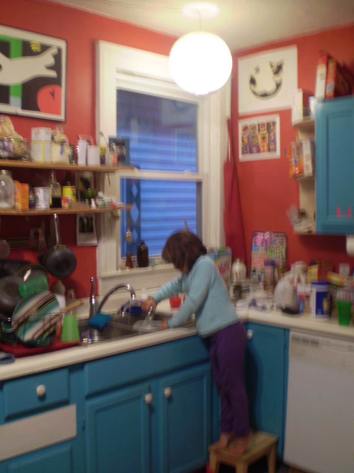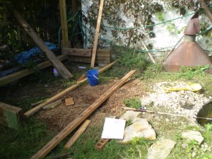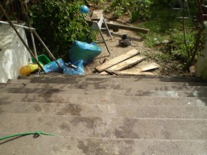 The MOST DANGEROUS WORKSITE EVER! Note: extension cord of improper “duty” snaking across top of large stairs, circular saw on ground, inflatable yellow crayon and big beach balls, garbage bagged in inappropriate, yet lovely, blue recycling bags.