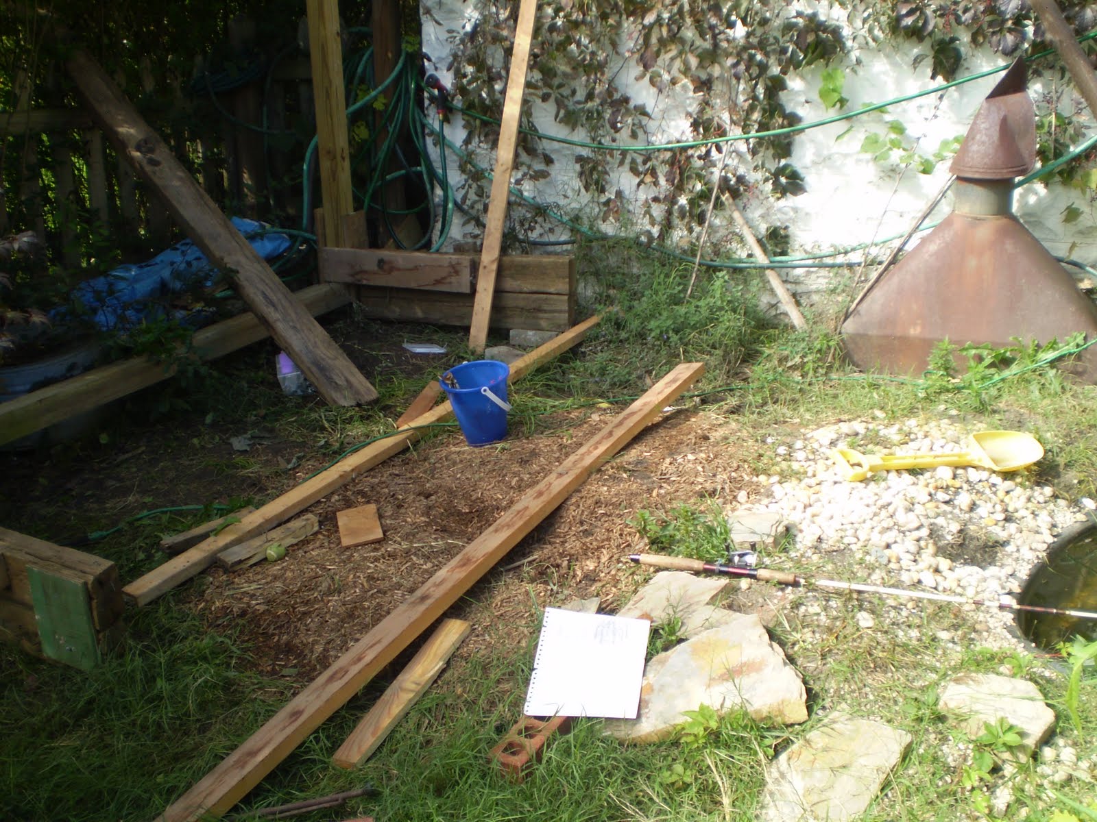 Fishing on job site in ill-conceived pond. Miscellaneous gigantic landscaping timber jutting over fence, plastic shovels everywhere.