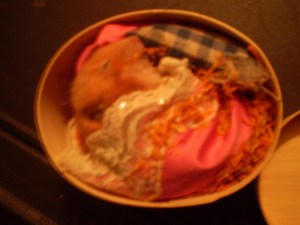 I knew it was a little morbid to take a picture of the deceased Hammy in her burial vessel. But, I wanted to remember that I took the time to wrap her in satin trimmed with sequined lace. That I made her a pillow filled with timothy hay and dried marigold petals. That Olive tucked a cat-toy mouse in beside her. It was a remarkably lovely ceremony in spite of the pre-dawn hours.