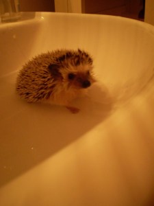 She needed a bath. A warm bath. And mealworms. I ran a hedgehog sized bath in the sink. I set the spiny ball on the bathmat while I fussed with the bath plug. It just sat there, like an anemone. ‘Dang,’ I thought, ‘this isn’t encouraging at all.’