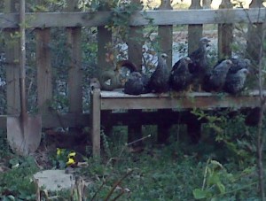 Here is a cellphone picture of my chicken ladies, roosting on the garden bench late in the afternoon. The yellow pansy beside them marks Hammy’s final resting place.