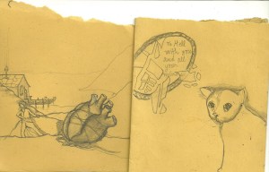 I drove home tired and on the edge of weeping. The sky heavy with stories of a possible snow. I sat down and drew a cat. Beaten up and slant-eyed. Not really pretty in anyway. It reminded me of Little. Strange Little who always seems close to death somehow, though he’s technically healthy for a cat his age. He has the feline equivalent of what modern educators call cognitive disability, but what used to be called mild mental retardation.