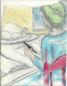 I am still drawing vigilantly, if with slightly less ritual. It’s biting cold outside. My fingers sting. Best to draw inside, an image from an unusual play performed by the children. Olive, the human cat. Leo, the gigantic human caterpillar (clad in two green pillow cases, a collapsible hamper for it’s pupae-skin… The caterpillar happens to have a suction-dart blaster, the cat sings like she’s on Broadway, arms flung wide.