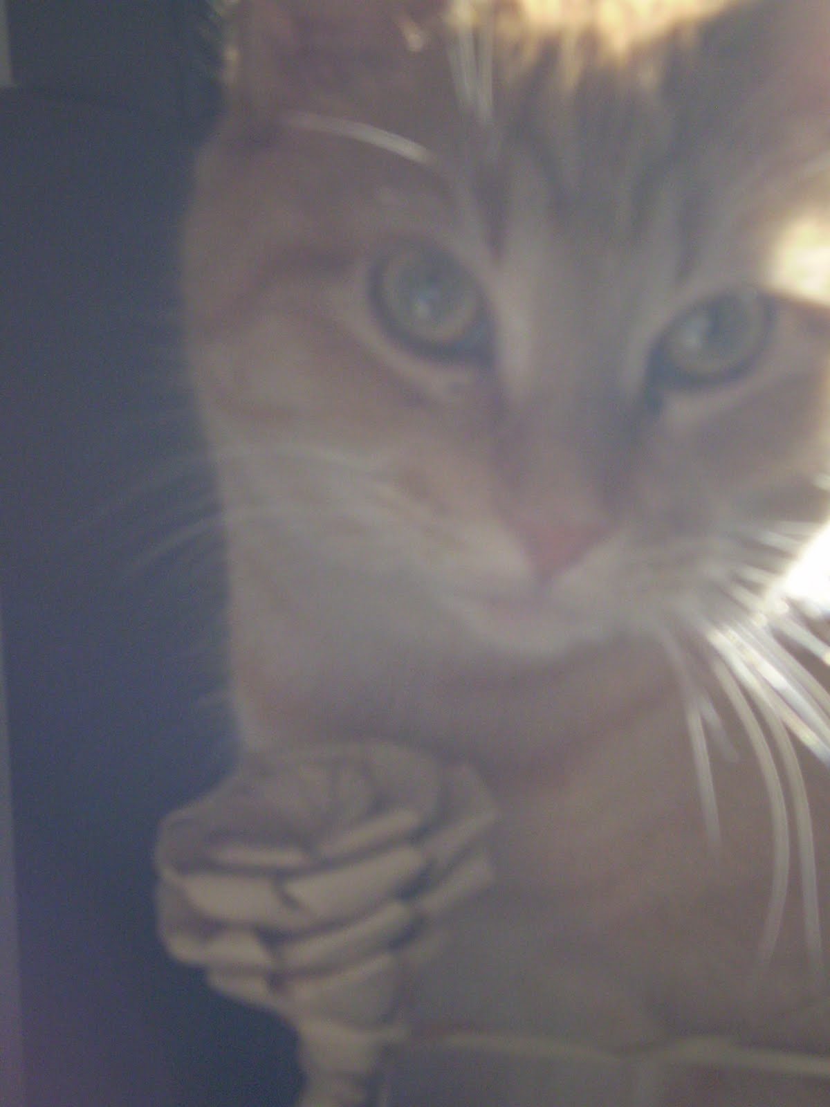 The fattest of our cats. Appears to be posing. The palmetto rose was folded by young hands in South Carolina, purchased with 3 crumpled bills at the waterfront. It seems that all the African American boys in Charleston know how to make these roses. They sit in groups of three or four, a five gallon bucket of fronds in front of them, folding and twisting. Making and earning.