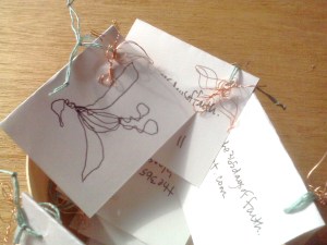 I don’t know when I’m going to get around to all these things I plan. I have the birds twisted and tied to small envelopes bearing their likeness. Presents for Strangers. The only problem is that in order to complete the launch of this project, I would need to actually make good on my word to try to place them in at least one store by…sheesh, tomorrow.