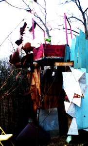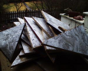I defiantly spray painted about 70 sq. feet of wood. Then I cut it up all willy-nilly, but mostly triangular – polygon. And then I put it together. Far from done, but in a strong direction. It’s not even about the chickens anymore. For all practical purposes they are living on the porch.