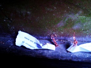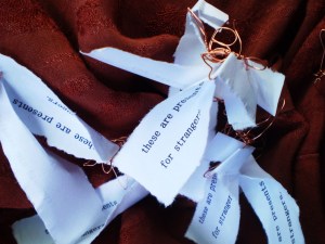 This is not work to be done in a studio. I put the tags on the birds in an elementary school parking lot. My children helped me to line them up and didn’t question why they had to be left for others to find. They seemed to like the idea.