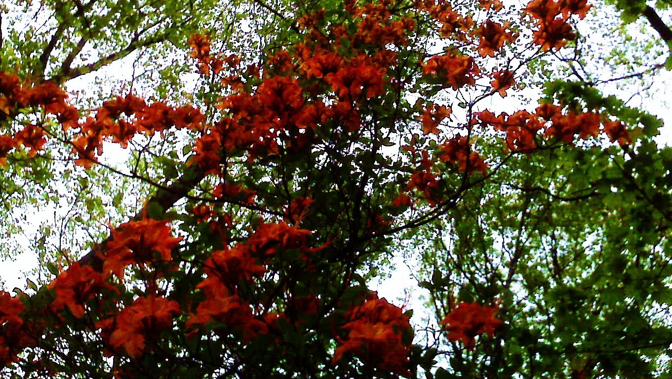 in a lovely N. Asheville home where everything was clean and level and just…almost inconceivable the differences in habitat amongst those who stand laughing on a flagstone patio. Really nice people. They didn’t question why I had to climb the hill above the cul de sac to step over terrestrial orchids and nettles in bloom, fiddleheads unfurling seeing one and then all at once. The Florida Rhododendron in bloom was a blaze of orange at street level, close up it was breathtaking: