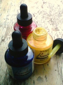 I have been using Bombay India Ink for coloration, and – in one case of extreme focus, coffee mixed with chocolate soy –