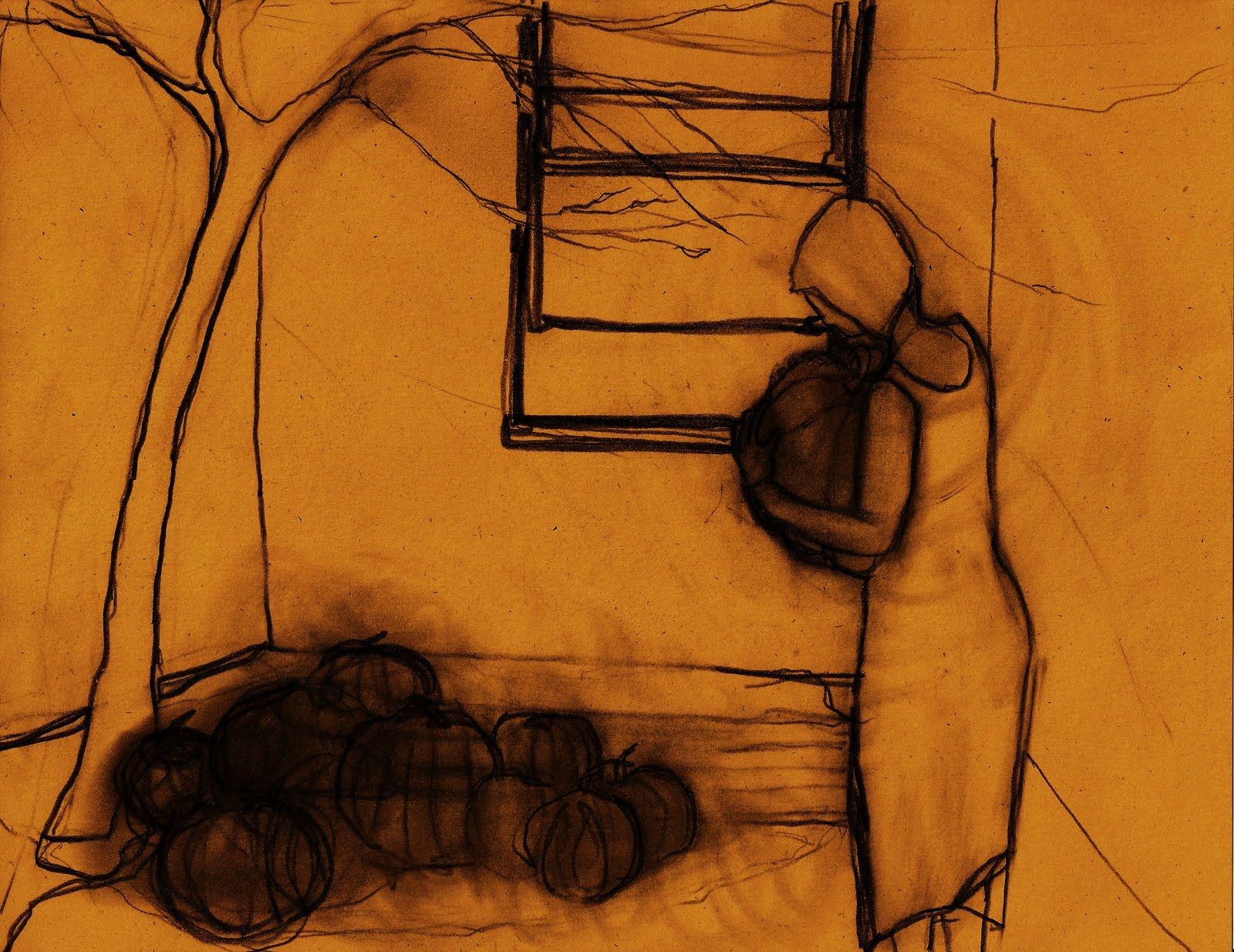 Why she’d been too scared to wake up! Now, she reckoned herself lucky to have not woken when the ghosts were about her like that. She looked around quickly and suddenly the woods around the old sugar house seemed slanty and still and the shadows were sharpened like teeth. She picked up her skirts and ran all the way home. Back across the fields of pumpkins and past the chicken yard and -stomp-stomp-stomp- up to the porch and she just went right straight to bed. She did. She heard The Pumpkin Farmer come in and take off his pumpkin farming boots. The Pumpkin Farmer’s Wife said something about dinner and The Daughter feeling peculiar.