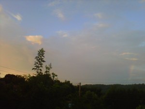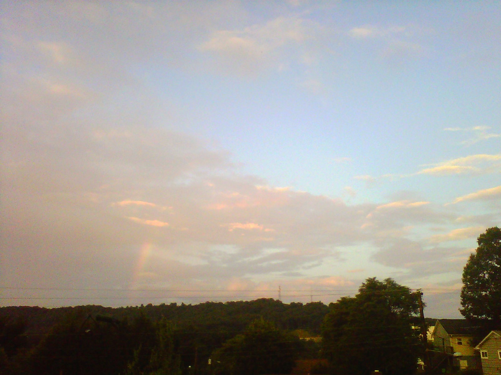 Dust. Drought. Pollution from Tennessee. Oh, I just noticed that the rainbow appears to be coming down through another of those odd circular cloud forms. Maybe it is god after all. Eh.