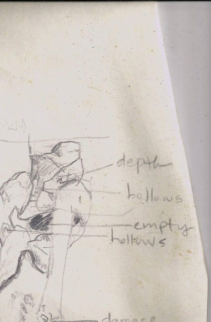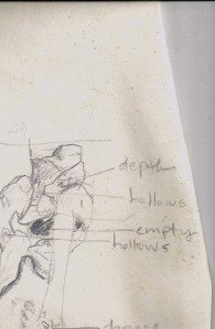 So big as to not even seem real. It was hot and my brother, visiting, and I drove down to PSU so I could take pictures of the whale skull. I think I only had a polaroid. There was something weird about it. Maybe it was hot and I was pregnant and my brother smells weird and we were just hanging out in the Biology building taking polaroids of bones…or rather, I was. My brother was sorta just waiting for me to be finished. I had to hurry and do this sketch. Noting the 3-D features of the actual and massive structure. Words like:
