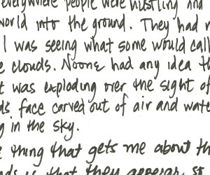 Well, when I was home this afternoon – the clouds were out in their full, strange force. I took a lot of pictures of a lot of clouds. Felt kooky and secret and saintly. Jeez, I don’t want to be a saint. What does a saint even do? I guess the upside of sainthood is that it certainly would legitimize my new career goal of sitting on the porch and daydreaming and somehow still paying bills, etc.