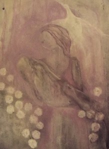 I was pretty inspired by the Merle Norman palette of mauves and pinks. It is a giant dead catfish she is holding, not a shrouded child as it appears in the small image of the larger, but not large, painting. It is nowhere near finished.