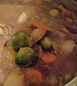 The recipe is easy. Put it all in a pot , at appropriate times, and let it simmer until delicious. Just start with with potatoes in a pot and smash them up, adding whatever is on hand. I’ll note the specifics of this (very gassy) brussel sprouts, red cabbage, TVP fusion at some other point. I used stone ground grits as a a thickener. Food not Bombs stew.