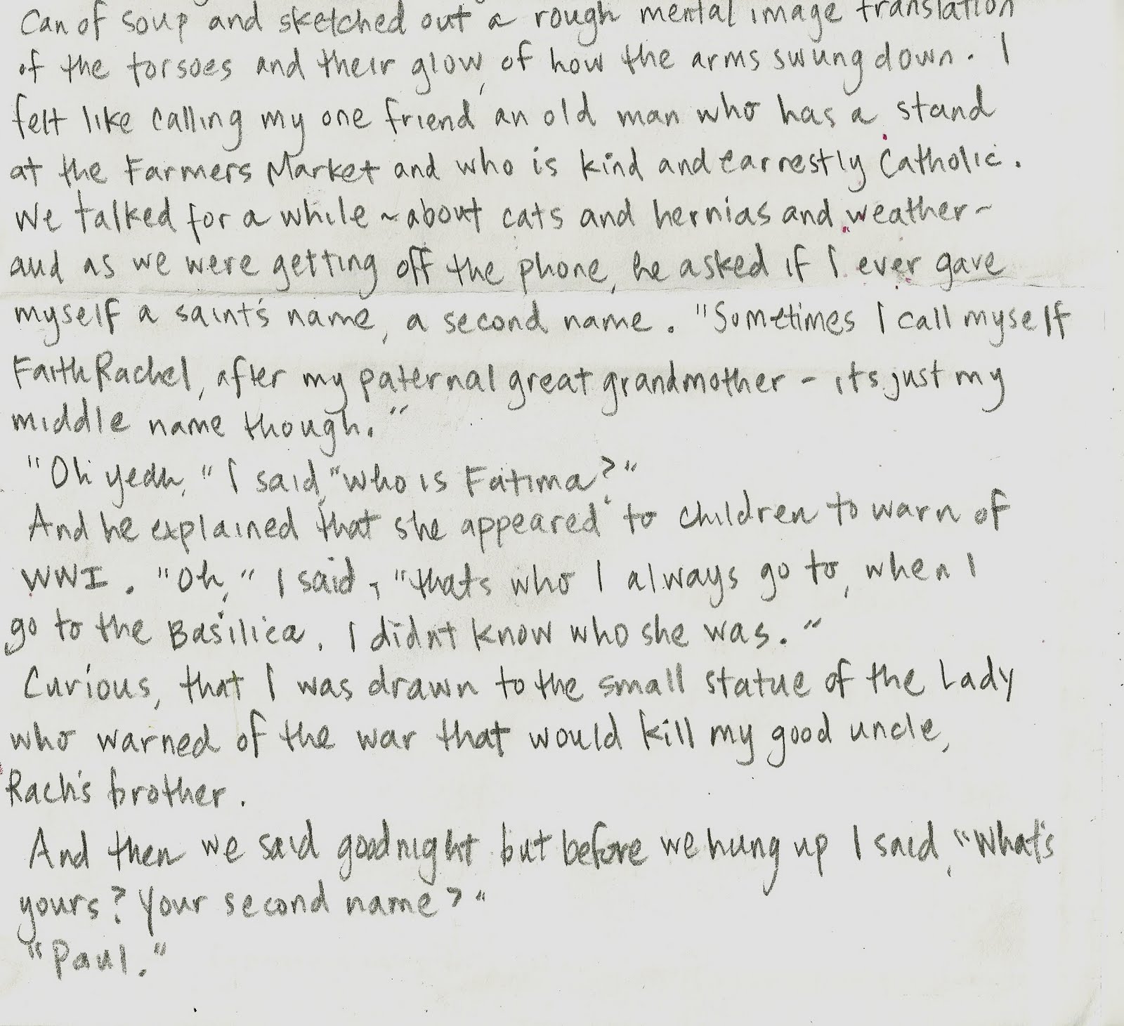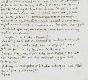 I went to try to feel something akin to clarity and I studied the faces and I sat and thought and the sadness was electric and, because I am a mother, I went to pray at the Virgin Mary and as I stood to leave, I caught sight of Fatima and I didn’t know who she was – other than a small statue…but, I stayed by her for almost an hour and I felt better, but no less compelled to look at clouds, when I left.