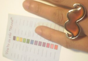 Moustache Mood Ring, which I believe may be magical, as it aptly identified me as being caught between passion and fear, with mild anxiety around the edges. The predominant color, however, was the dark red of passion and I’m inclined to think that said passion is held for things like the belief that a moustache mood ring can be magical and that somehow good ideas can save the world from bad ideas.