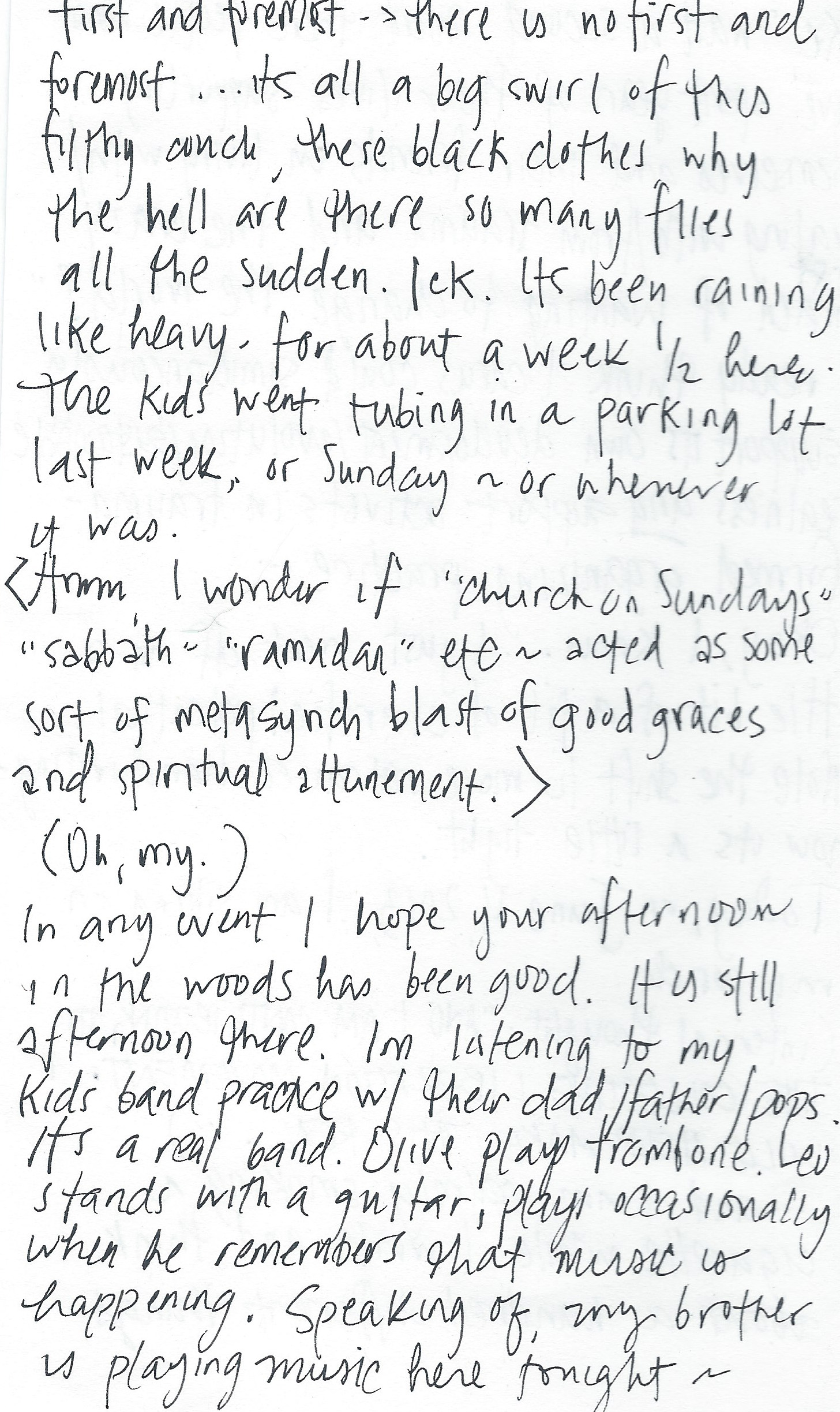 Yesterday, I went to a show in a basement and I watched fireflies in the trees that ran along the edge of the backyard field. My brother was playing drums and the damp-concrete-and-sweat-smell was familiar. He informed me that he had started a theatric jest metal band and that their first song was an homage to watching clouds as velociraptor spirit rose up in the people, transforming DNA through a single Christly cloud drop.