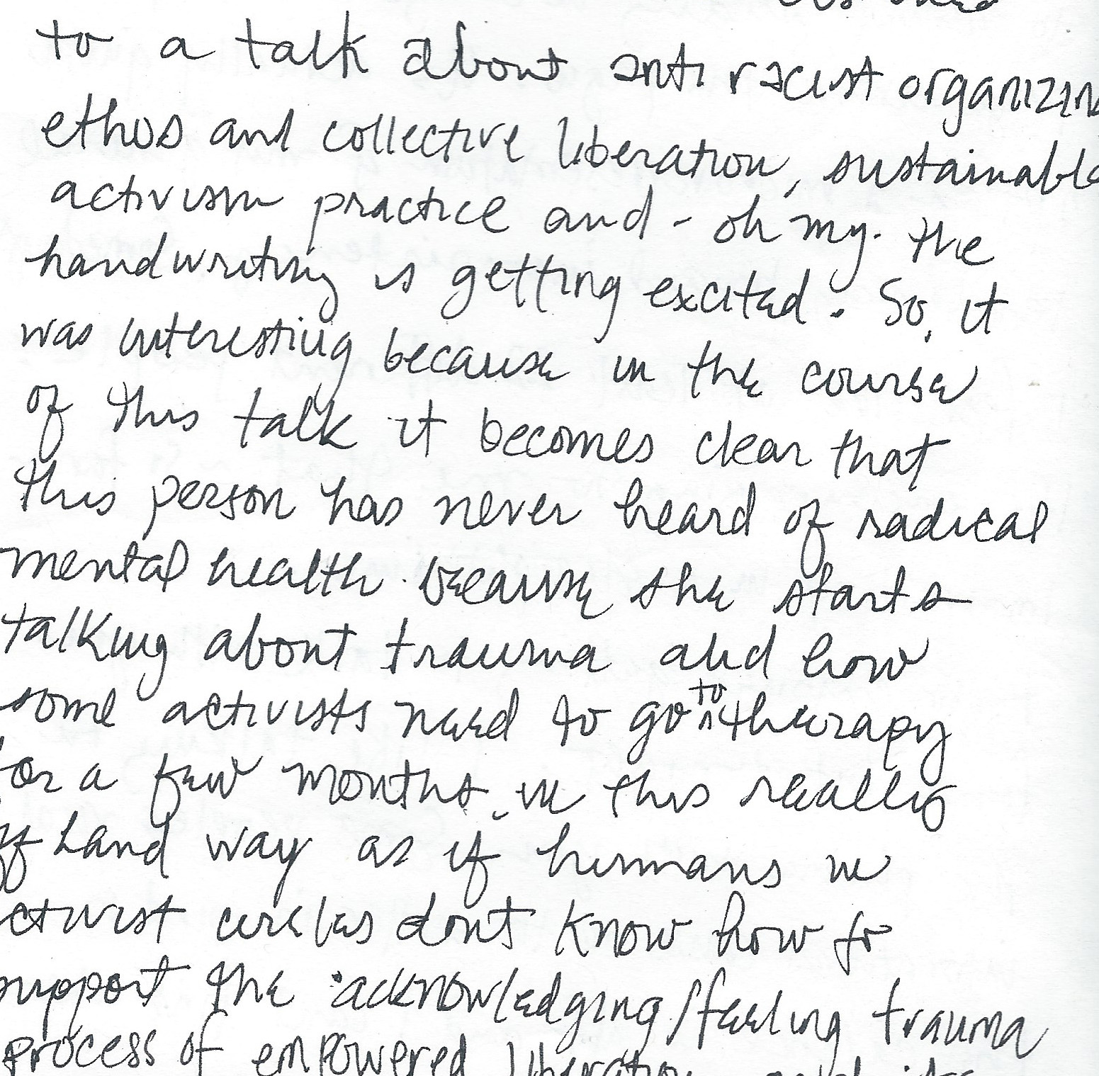 Which leads me to what I’m really getting at which is that it seems important to figure out messaging of collective liberation that can be effectively implemented into broad culture and practice in regard to mental health and everything else.