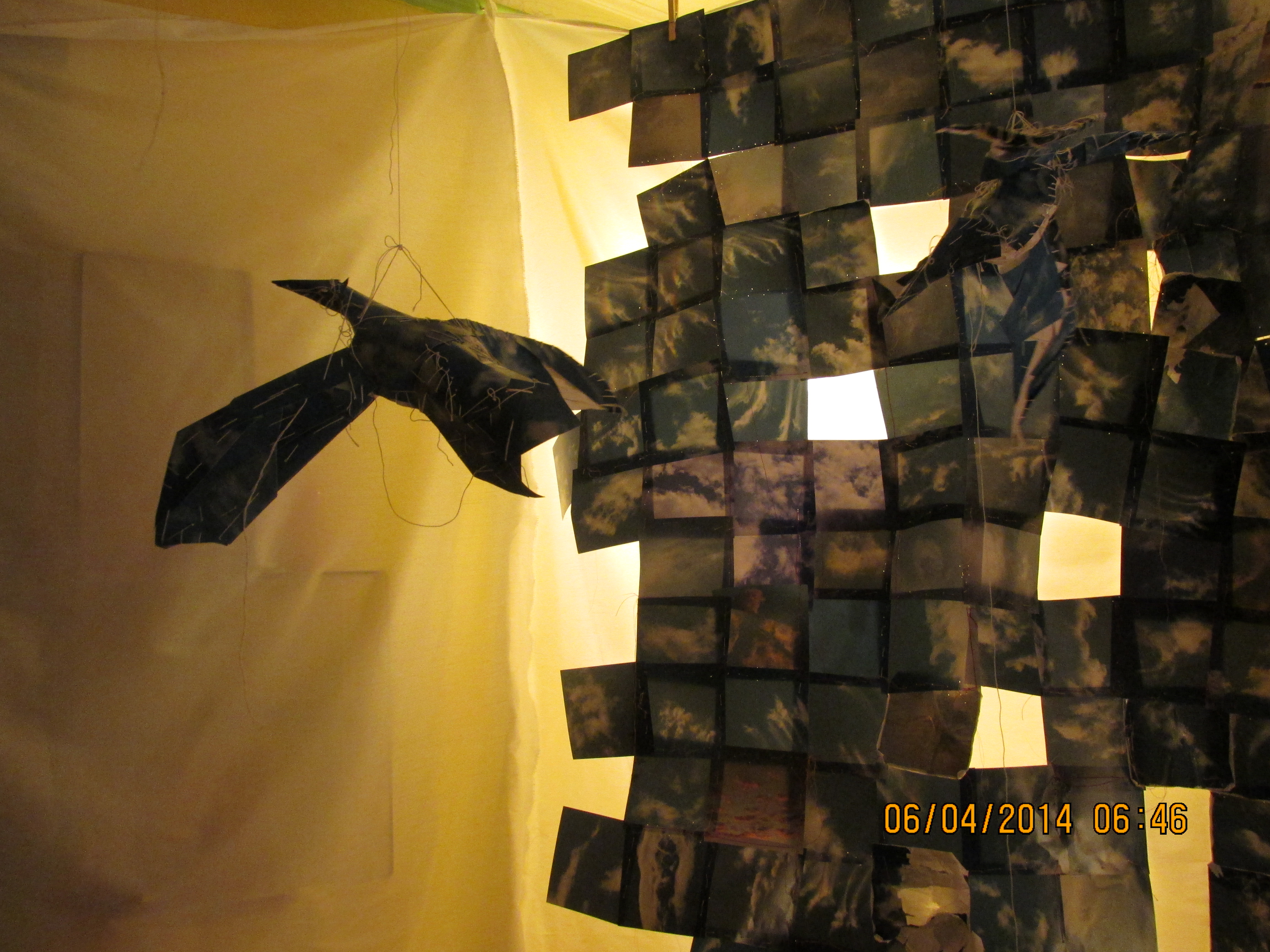 In July, I am showing an installation of cloud photographs and bird sculptures in Vancouver. It is my first “real” show. I have stayed up until the middle of the night lately, stabbing needles through photographic paper, stringing together clouds with golden thread.
