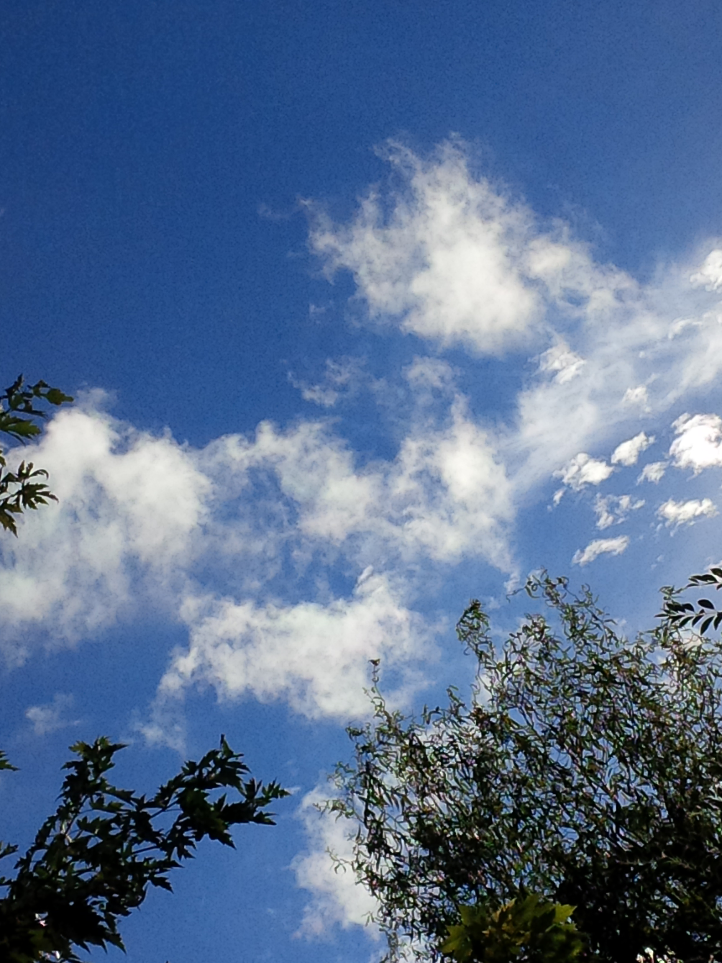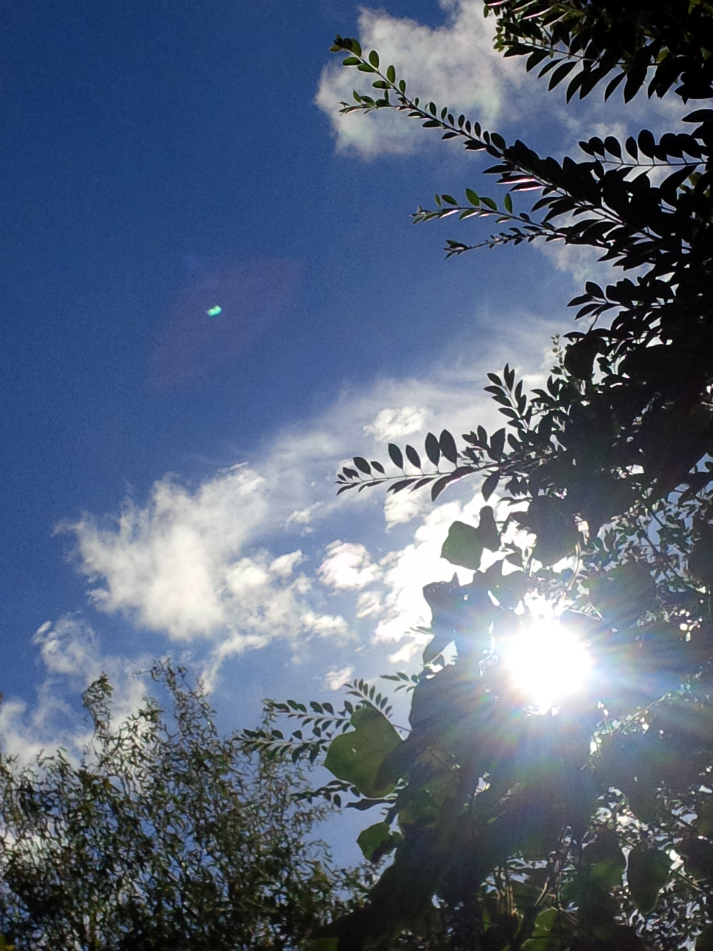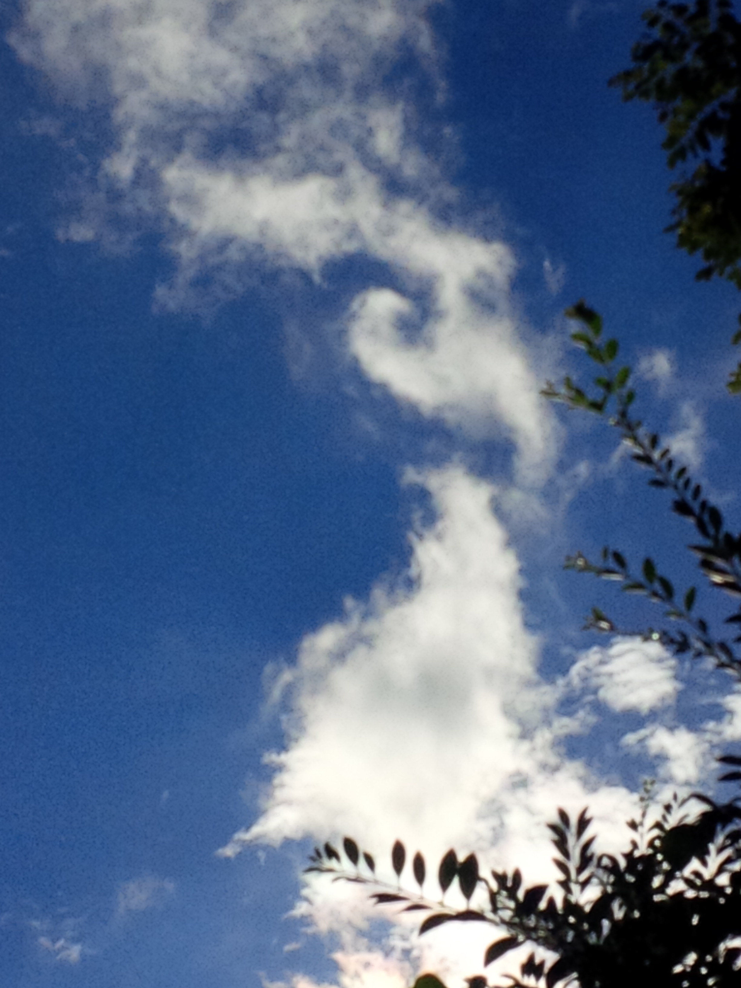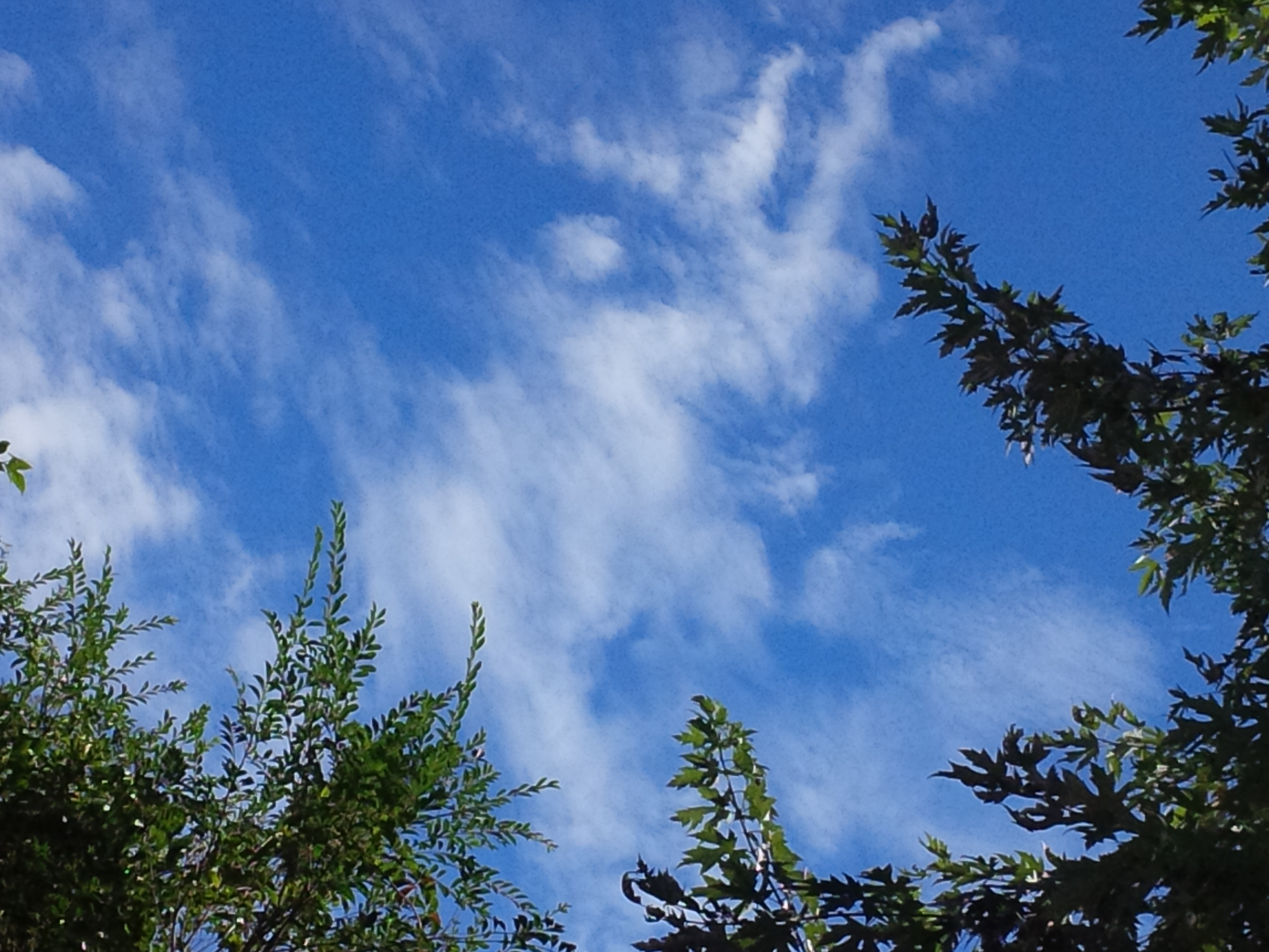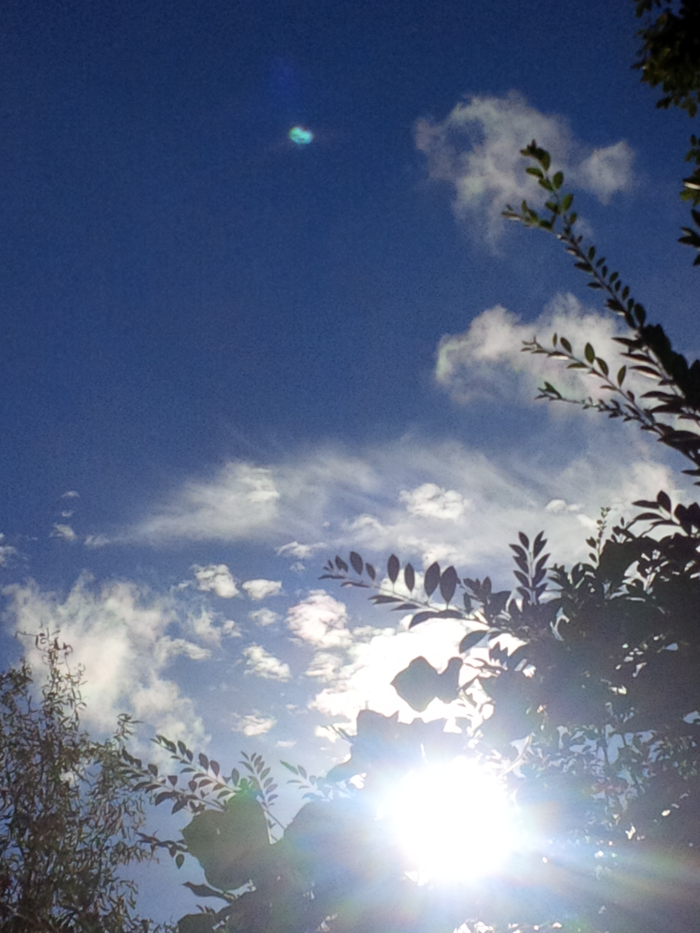 [I was not aware of the small green spot here, until I uploaded these images to my computer from my phone, which is also my camera. I don’t know what the small green dot is, nor do I know what the odd almond shape that seems to surround it is. Glitch, I guess. It’s a pretty color green, isn’t it? I didn’t see it when I was taking a picture of those cloud formations, which something about them or the way I felt when I saw them must’ve taken my breath for a minute and seemed amazing…otherwise, I wouldn’t have taken a picture.]