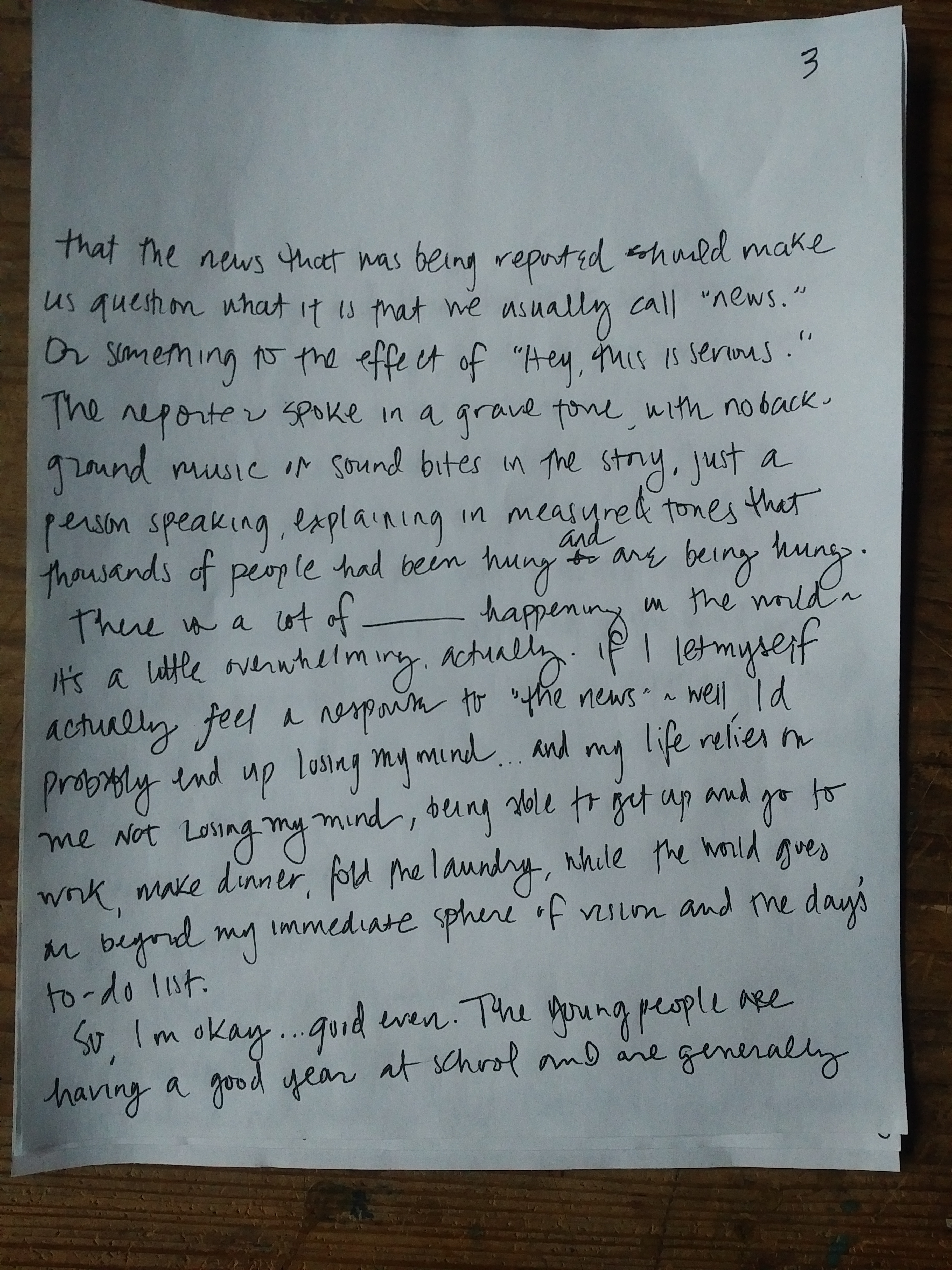 So, not only do you lose a person or people you love and who your life is defined in relation to, but you also get severed from the privilege of forgetting and can no longer inhabit a world in which what happened ceases to matter, because it will always matter. God, that makes me sad. I don’t want to forget, or be numb to reality…even if I don’t see it, even if it’s not my town, not my family.