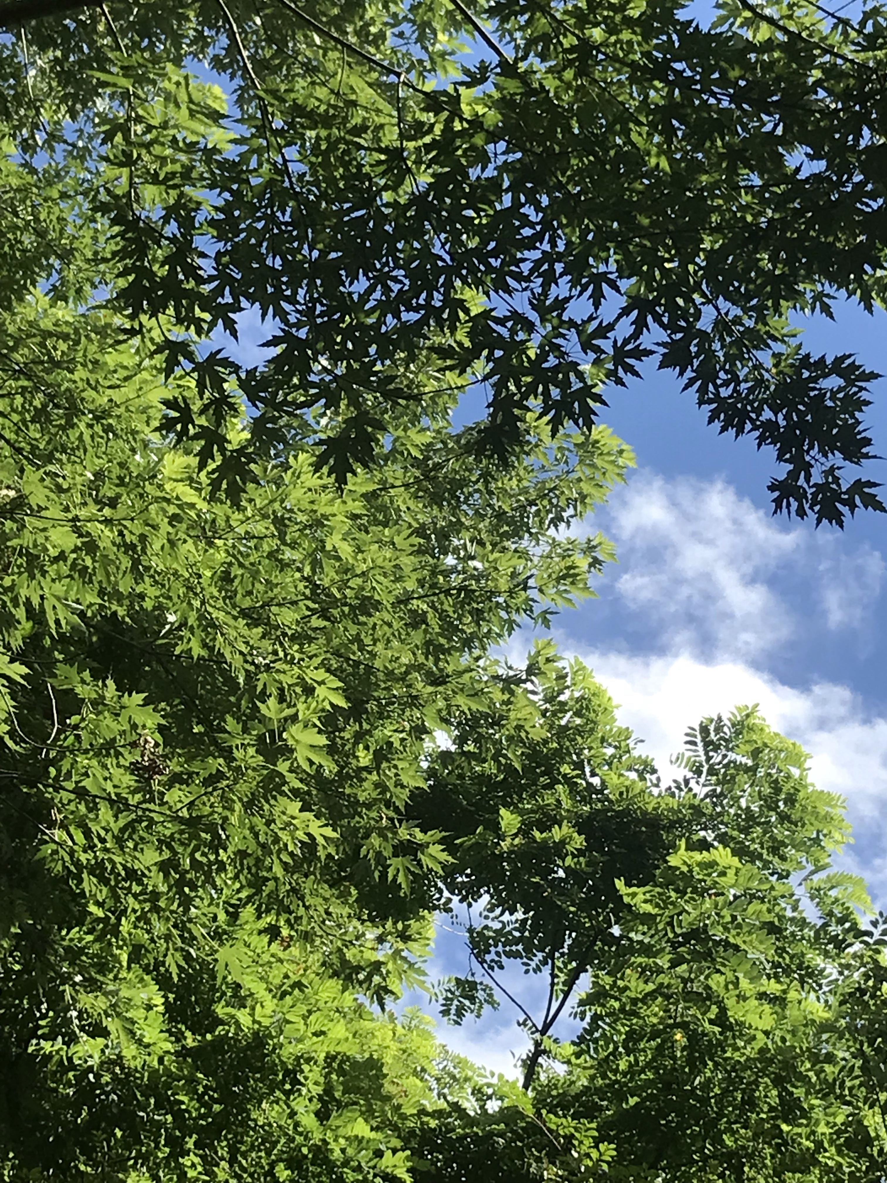 I looked up at the sky. I have been doing that again, because – like I said – I’ve been writing some about the clouds, about what I saw and how I read it. There were some angular forms, and what looked like a figure, an lumpish angel or a manatee, a shape in the clouds with tendrils being pulled by the wind, making a new shape even as I walked toward the corner. Through a break between the street trees, I saw that there were numberish snakes of thin cloud that had settled out front of the mass that was breaking up, expanding and shifting above me and my dog, the woman on the bench. If I crossed the street to the steps of the Varick, I’d have a clear shot. I got my phone out of my pocket, and kept walking up toward the corner, staring hard at the trees above me, but also trying to seem like just a person walking a dog. A 12 lay on its side in the sky. I said hello to the woman at the bus stop and she was sweet like most broken women are to strangers, trying to be nice, to be pleasant. The dog smelled around the bench, and I tugged him a little, saying, “C’mon, leave it.” The 12 was gone when I got to the corner, and I took a picture anyway, took a few. Standing in the sun and staring hard as cars turned the corner. I was struck with a sense of knowing that I had failed, that there had been a brief thing shown to me and that I had not crossed the street to where I could get a clear view, a clear picture. I had chosen to not confuse or offend the woman at the bus stop by a sudden crossing, had chosen not to be a person taking pictures of the sky across the street on the sunlit steps of the Varick Chapel, had not wanted to seem weird or out of the ordinary. I felt a flicker of knowing that I had been tested, and that I had failed, choosing my vanity and social appearance over bearing witness to a 12 written in the sky with clouds. All the sudden, I remembered the reality of it, that whole period of time when I thought I was seeing something written by God, shown to me by God, in the sky, and the remembering of the reality of how desperate and pressured and consumingly strange those long days and months were, the determination to watch and document relentlessly, to the exclusion of everything I could put off or neglect, agonizingly distracted in my attentions to all that I could not put off or neglect, my children impatient in the car as I stopped in a parking lot to try to capture the living sky that nobody else seemed to notice. My mother going blank and awkward as she drove us to the home improvement store, a family outing to buy flowers, me leaning across her as she slowed to stop to turn, my voice flat and transfixed as I muttered something about, “…it’s everywhere, see, right there…there is this blue light around that cloud. I have to take a picture.”